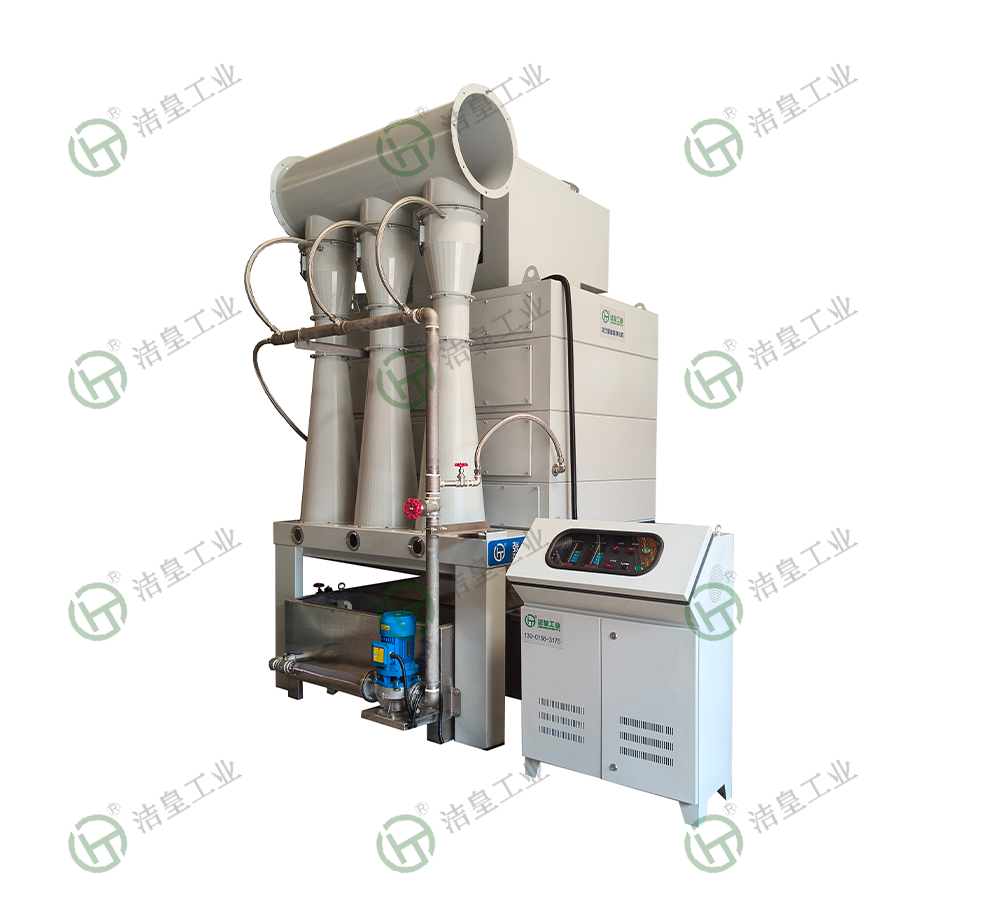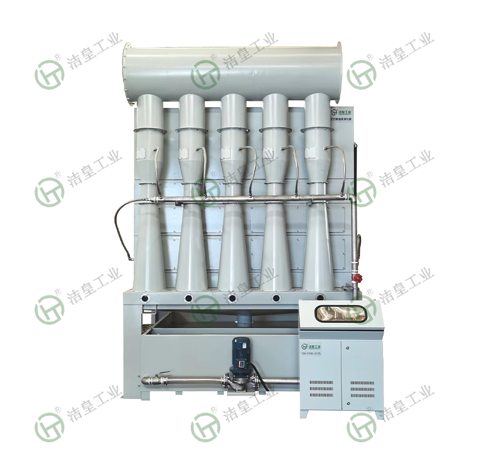 該機利(lì)用文(wén)丘裏原理(lǐ)和氣(qì)相負壓使得噴淋液相形成(chéng),將吸入(rù)的(de)煙霧,塵埃和廢氣被水霧(wù)、水(shuǐ)漫捕捉吸附形成大液滴落入淨化池,部分細沫通過初過濾、高效(xiào)過濾除(chú)沫器浸潤吸附回落淨化池。淨化池沉澱水供給循環泵循環噴淋,周而複始,水位由液位器(qì)控製,進水管自動補給(gěi)運作(zuò)所蒸發的水(shuǐ)汽損失(shī)。沉澱池底部的淤泥或碎屑可通過撈渣口人工清理或鬥式水箱底部球閥排(pái)出。該機過濾單元無堵塞,高(gāo)沉降分離效率,排出空氣符合標準。該(gāi)機模(mó)塊化設計組裝,零件(jiàn)噴塑處理(lǐ),工況需要(yào)亦可不鏽鋼製作。油霧濃度較大時,應加裝旋風濕式除塵器使用,可減輕過濾器壓力和損耗,更好地保證性能。