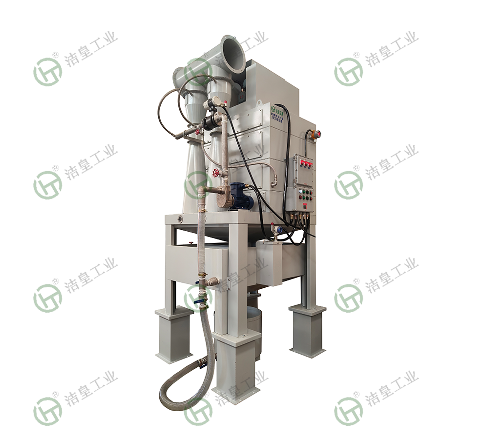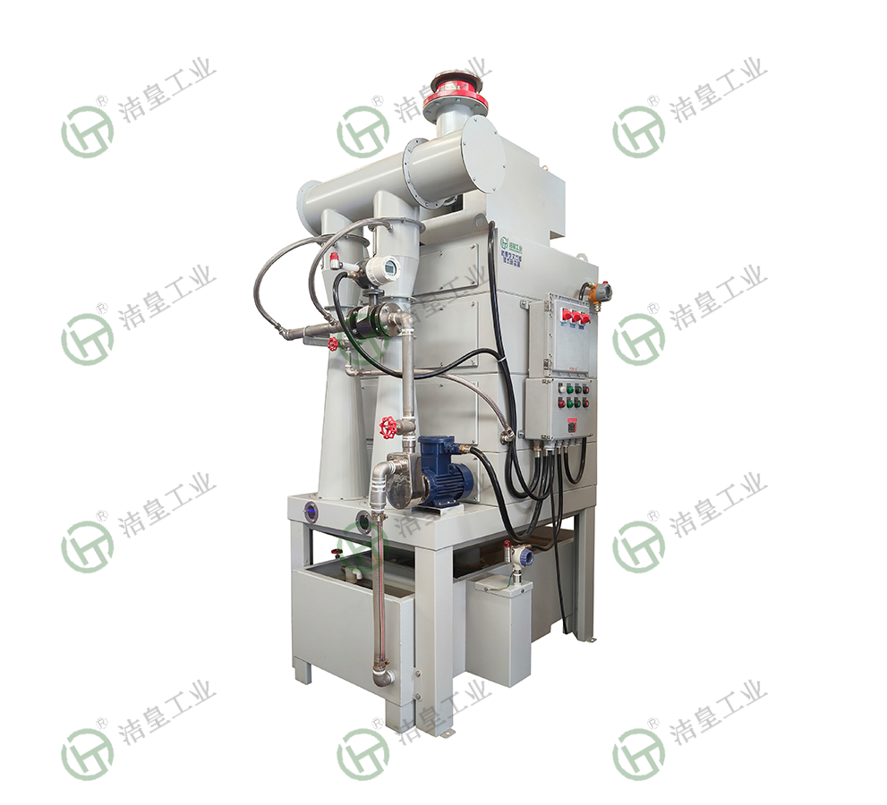 該(gāi)機利用文丘裏原理和氣相負壓使得噴淋液相形成,將吸入(rù)的煙霧,塵埃和廢(fèi)氣被(bèi)水霧、水漫捕捉吸附形成大液滴落入沉澱池,部分細沫通過初過濾、高效過濾除沫器浸潤吸附回(huí)落沉(chén)澱池。沉澱池沉澱(diàn)水供給循環泵循環噴淋,周而複始,水位由液位器控製,進水管自動補(bǔ)給運作所蒸發的水汽損失。沉澱池底(dǐ)部的淤(yū)泥(ní)或碎屑可通過撈渣口人工清理或鬥式水箱底部球(qiú)閥(fá)排出。該機過濾單元無堵塞,高沉降分離(lí)效率,排出空氣符合標準。該機(jī)模塊化(huà)設計組裝,零件噴塑處理,工況需要亦可不鏽鋼製作。粉塵濃度較大時,應加裝旋風濕式除塵器使用,可減輕過濾器壓(yā)力和(hé)損耗,更好地保證(zhèng)性能。